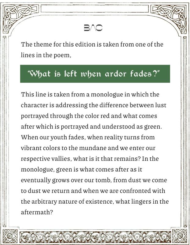 Thus Spoke embodies this philosophy by each edition taking inspiration from a past piece of work or art and using it as a theme or foundation upon which new work can be created. Thus Spoke: Sir Gawain and the Green Knight is inspired by the medieval poem “Sir Gawain and the Green Knight” and the theme, “what is left when ardor fades?”, touches upon the theme of decadence and virtue within the poem. It posits the question of when the vibrancy of life fades, when what was once sprung full of life crumbles to dust, what is it that drives our existence, and is our virtue reduced to dust or does it prevail under the cruel currents of time?