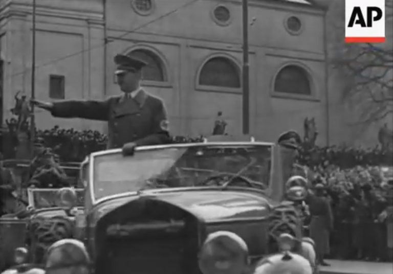 Swastikas and Nazi flags are everywhere. Hitler salutes and the crowd salutes back. Nazi soldiers are everywhere.