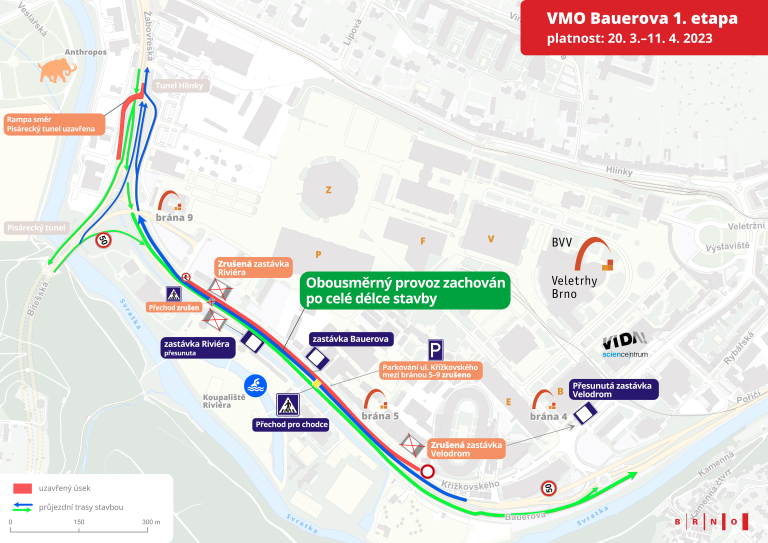 - Some public transport stops will move. In the direction of Pisárky to the center, the Riviera stop will be relocated 150 metres closer to Poříčí. In the direction from the centre to Pisárky, the Velodrom stop will be moved in front of exhibition hall B and the Riviera stop will be suspended, but the Bauerova stop will remain in operation.